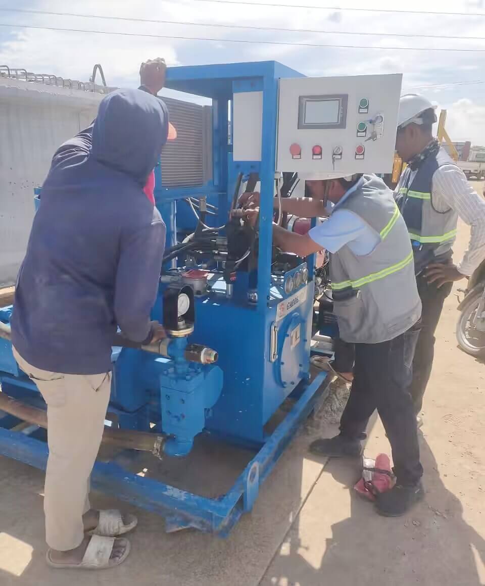 High-speed, high-shear colloidal mixer cause a vortex flow to ensure mix quickly and evenly. Water, cement or bentonite is quickly mixed into a homogeneous slurry. Then the mixed slurry was delivered to the agitator. Grout pump injects from the mixing drum (storage tank). This ensures a continuous mixing and grouting operations. The grouting plant is hydraulic drive with electric motor. Grouting pressure and displacement of this bentonite grout mixing plant is adjustable.