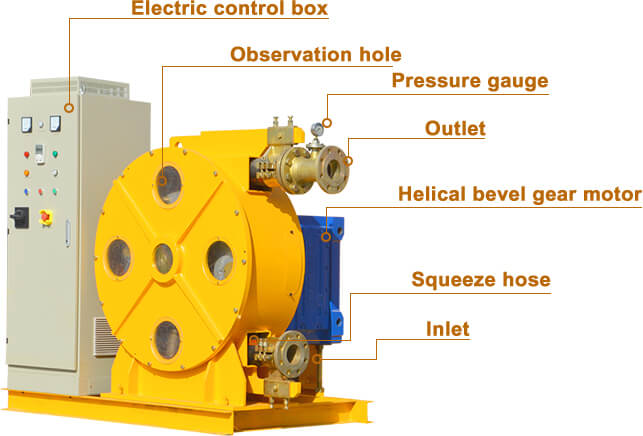 GH100-915B high pressure hose pump is used for construction, pharmacy, textile mill, dye making, water treatment, paper making, mining, ceramic, brewery and beverage, underground engineering, etc. It’s perfect to pump corrosive, abrasives, shear sensitive fluids, high viscosity fluids, high density fluids, large solids, metering(±1%), high pressure(3Mpa).